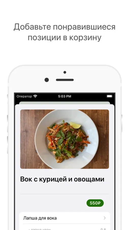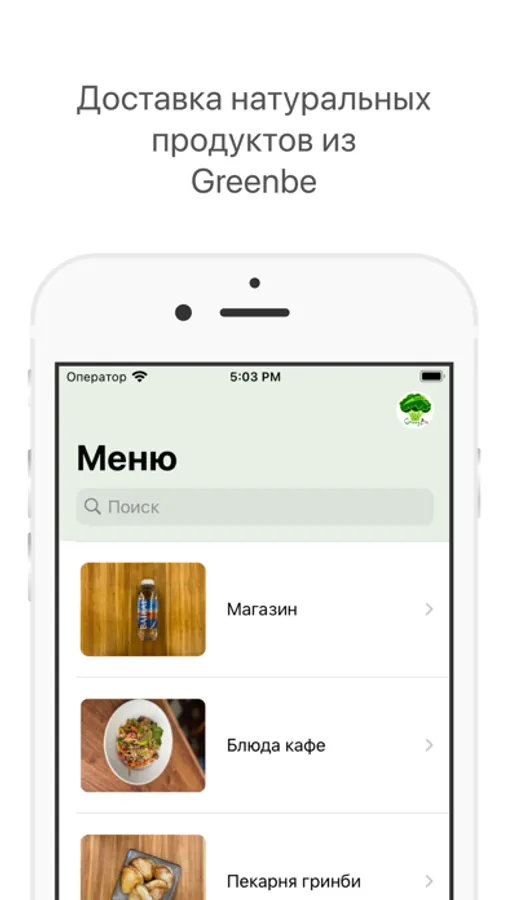 Как сделать заказ в приложении “Greenbe”: выберите понравившиеся позиции из меню, добавьте их в корзину и перейдите на экран оформления заказа (по нажатию на иконку корзины).