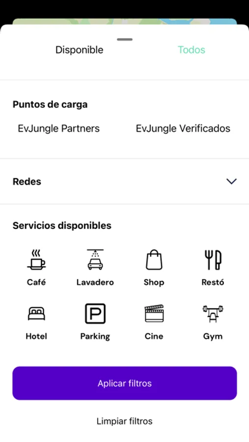 - Activar filtros como: tipo de conectores, corriente, potencia, redes de carga y servicios que ofrece el punto mientras estás cargando.