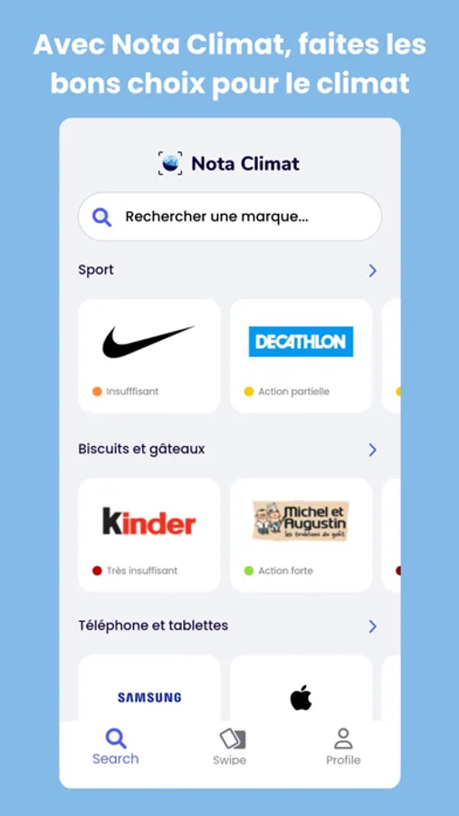 L'application Nota Climat vous permet de chercher et de comparer le niveau d'action des marques. Décryptage de toutes les grandes marques de tous les secteurs : High-Tech, Hygiène, Beauté, Mode, Sport, Luxe, Alimentaire, Produits ménagers, Opérateur télécom, Mobilier...