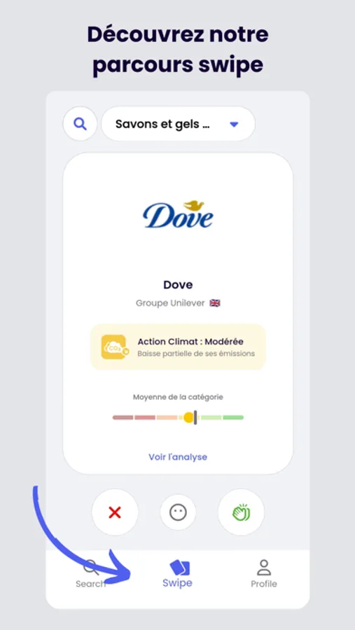 Sur chaque carte, découvrez le niveau d’action de la marque, et swipez les cartes pour exprimer votre sentiment !