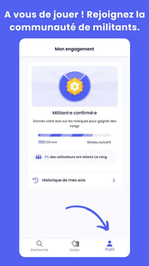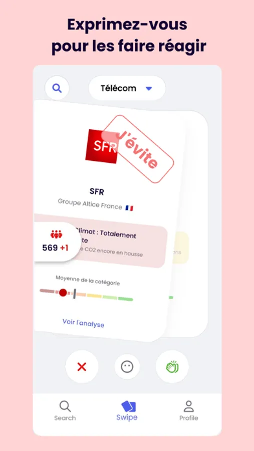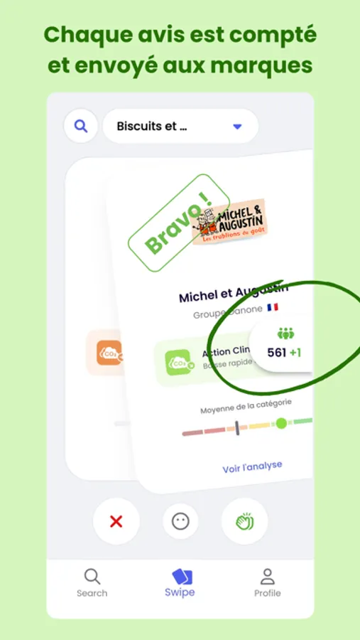 En swipant ou en appuyant sur les 3 boutons "J'évite !" - "Sans avis" - "Bravo !", exprimez votre sentiment aux marques pour les faire réagir ! On décompte tous les avis exprimés et les affichons haut et fort, pour montrer qu'on est des millions à vouloir qu'elles accélèrent leur action !