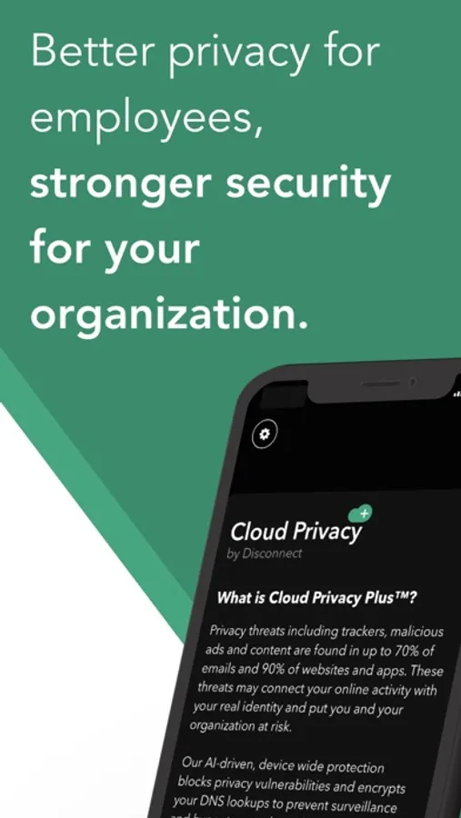 Cloud Privacy Plus for Work by Disconnect is an AI-driven, DNS based domain filter delivered as a service from the cloud that protects employees and organizations from advanced privacy threats. Cloud Privacy Plus for Work is for employers who have subscribed to Disconnect's enterprise program. Employee devices will either be auto-enrolled or given instructions and an authentication code to unlock protection.