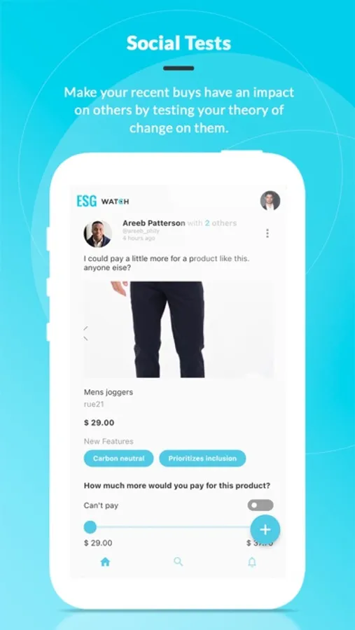 Social Tests - Engage further and test your own theory of change by directly soliciting feedback from other users on transforming recent buys into impact purchases, through the app’s “Social Test” feature or create impact challenges to begin taking action on your beliefs.