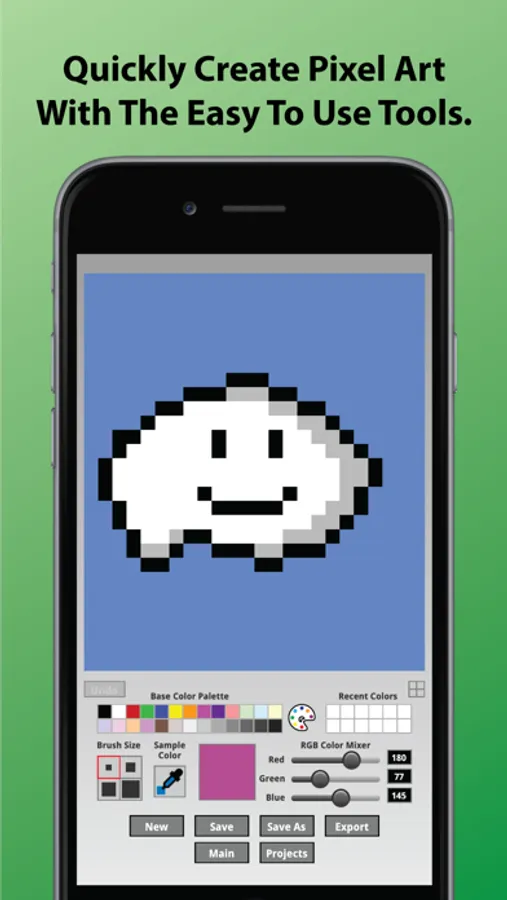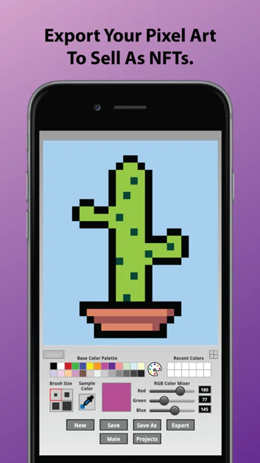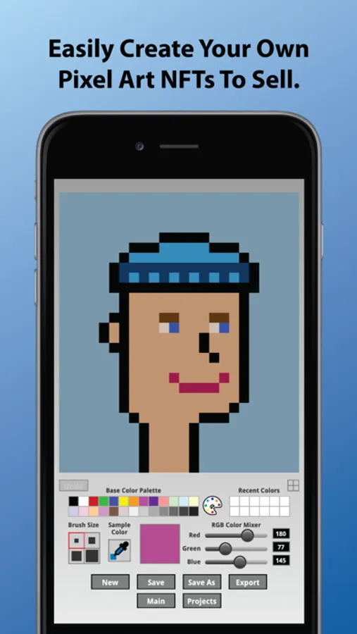 Create amazing pixel art for NFTs, projects or just for the fun of it with this easy to use pixel art creator! Quickly design and save your own NFTs. Export to your photo library when you are ready to upload to a NFT marketplace blockchain like Opensea, Axie Infinity, Rarible, Nifty Gateway, and SuperRare where you can sell your art.