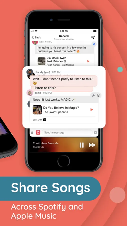 Find songs, share music, and listen together with Earbuds. Whether you use Spotify or Apple Music, Earbuds lets you share, create playlists, and chat about the songs and playlists you love with others for a truly collaborative music experience. Stop juggling apps and texting links with tons of ads. Earbuds instead.