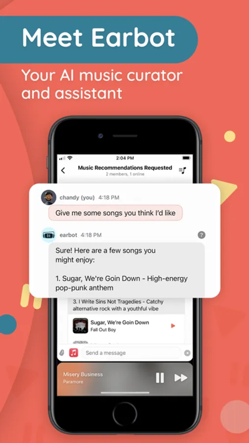 Now Earbuds takes your playlist maker to the next level with Earbot. Simply input prompts and our AI music assistant can provide recommendations, create a new music playlist, or even help you navigate the Earbuds app. Summon Earbot easily in any channel and access the benefits of a complete music helper at your fingertips. Find music, add new songs to your playlist, or identify that song on the tip of your tongue, Earbot can help with it all.