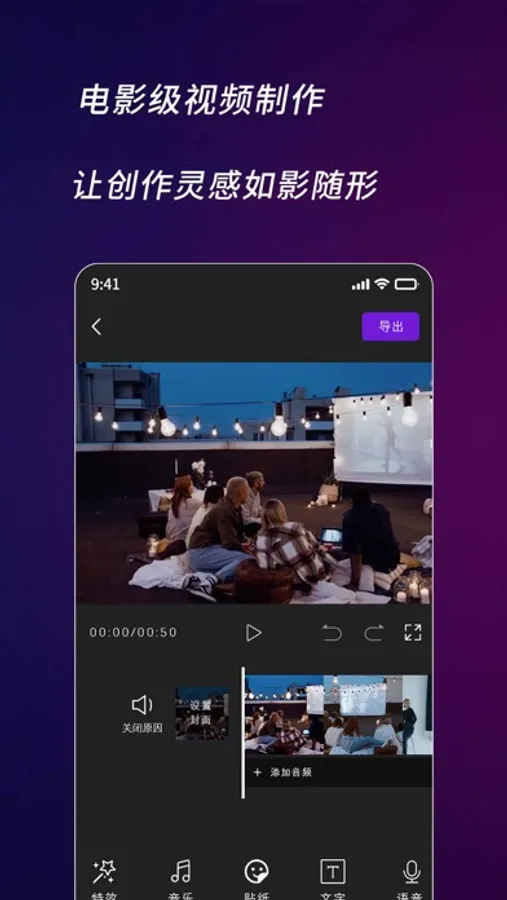 【4】通过电影级滤镜、转场、音乐、字幕、调色等创造一部电影画质的影片,让你拥有随时随地进行无限创作的乐趣,轻松创造一部属于自己电影画质的影片。