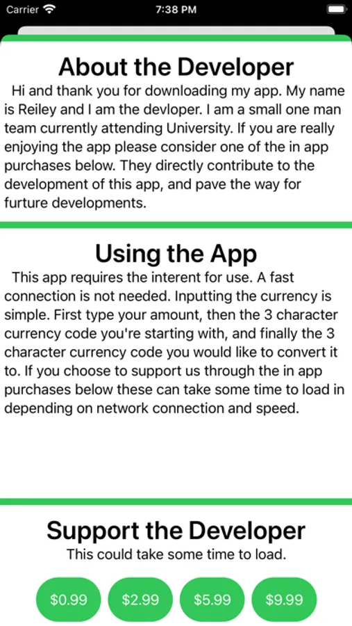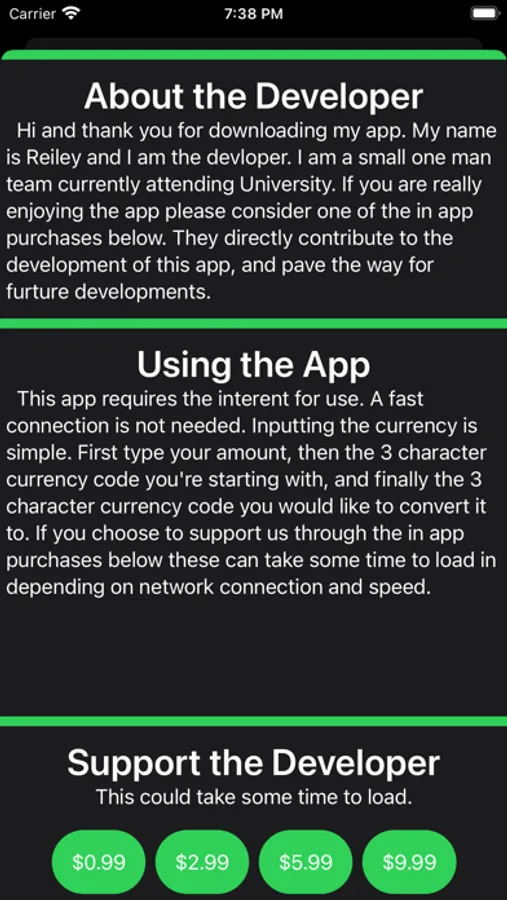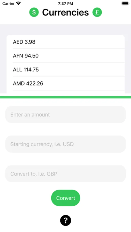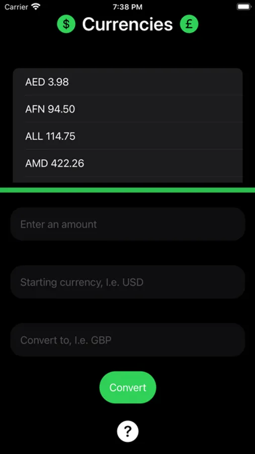 A quick and easy way to convert from one currency to another using the 3 character currency code. Select cryptocurrencies are supported, such as Bitcoin (BTC). Offers support for both light and dark mode depending on device settings. This app uses data pulled from the internet for the most up to date currency conversions available. An internet connection is needed to pull the necessary data.