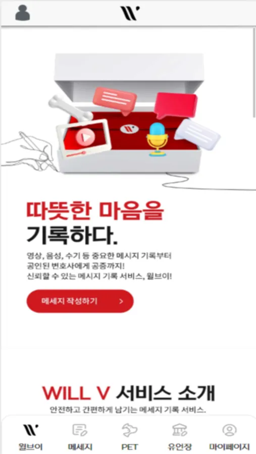 윌브이는 유언장을 기반으로 다양한 형식의 메세지를 남기는 메세지남김앱입니다