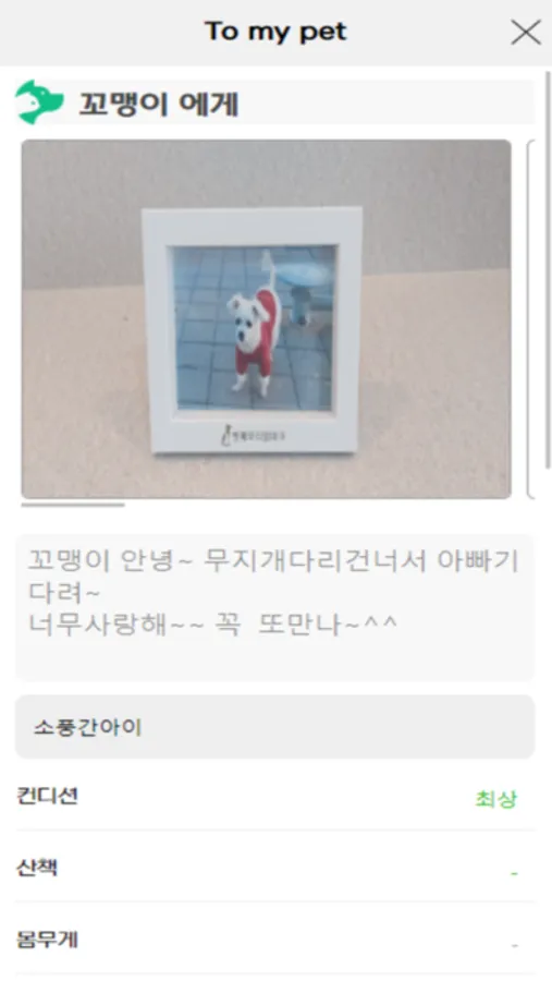현재 내가 키우는 반려동물의 성장일기는 물론 무지개다리를 건넌 아이들에게 추모의 메세지를 남겨주세요