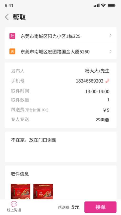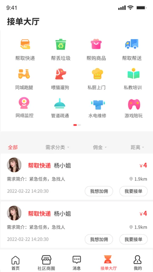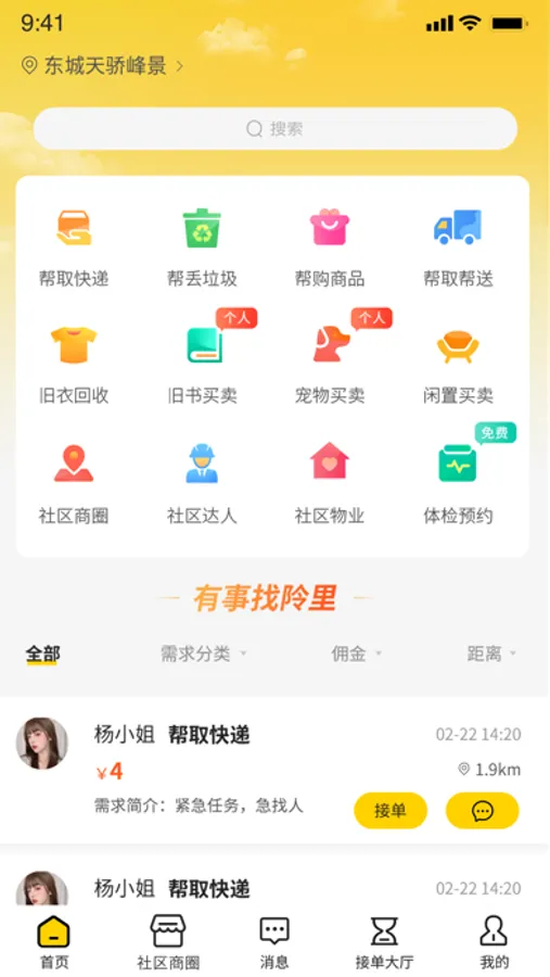 用户可在app内发布帮取快递,帮取帮送,帮倒垃圾等生活需求