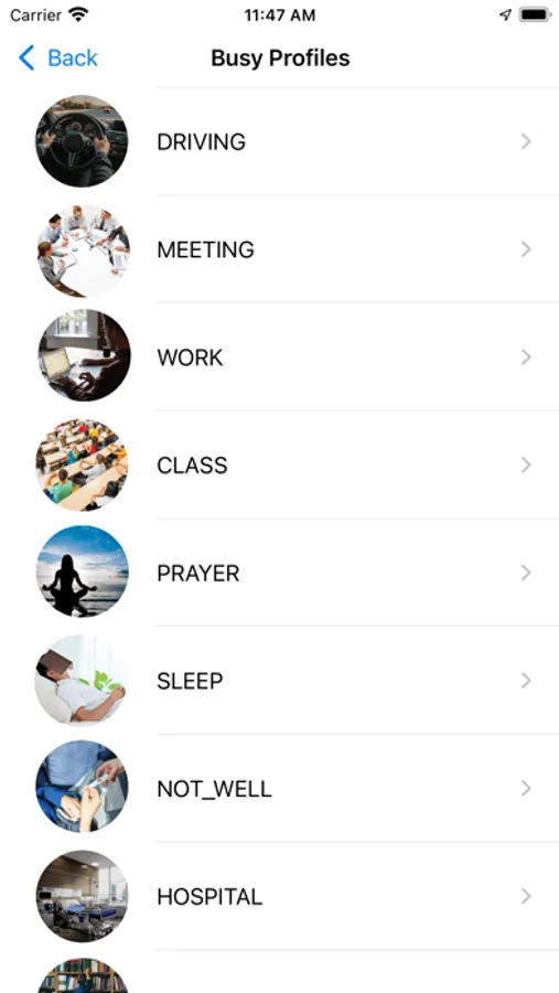 • Set Current Occupancy level by setting busy profiles such as ( meeting , work , prayer, sleeping , unwell , withfamily , funeral , etc..) , where Calle can set any on given standard profile and caller will be informed through SMS and play back tune automatically with specified time by Calle.