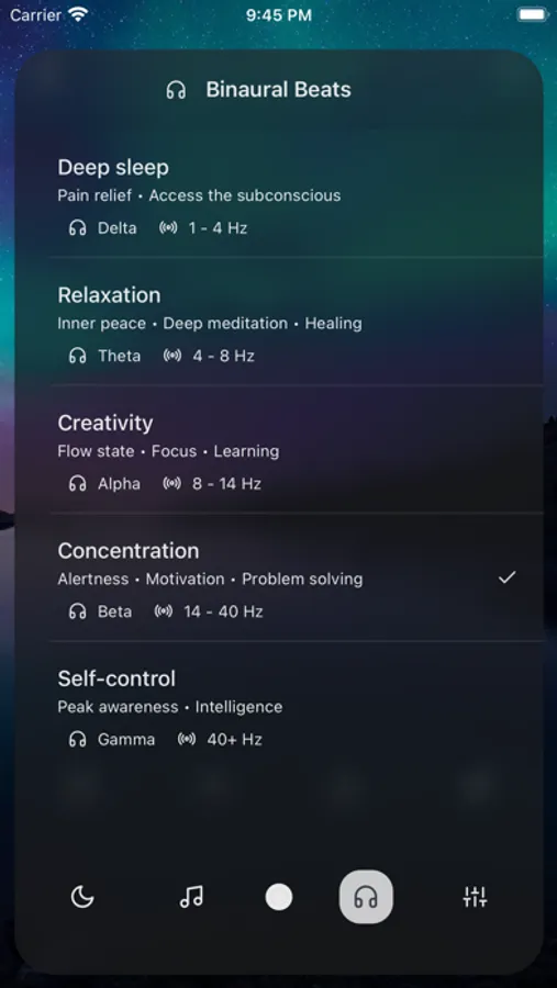 • Binaural beats selection - Achieve your desired state of mind with ease.