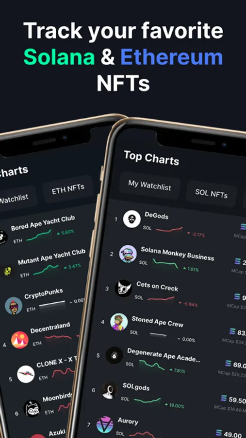 Tracks all of the top NFTs on the Ethereum and Solana blockchains. Our tracker automatically stays up-to-date with price data from the NFT marketplaces OpenSea and MagicEden in order to ensure floor price tracking and our NFT collection information is accurate.