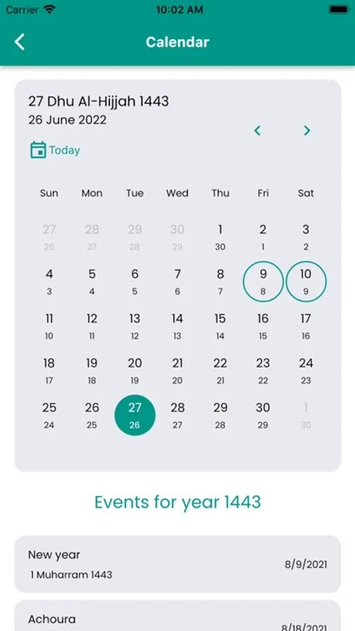 A calendar that displays the days with Hijri and gregorian months with a list of the annual Islamic events dates