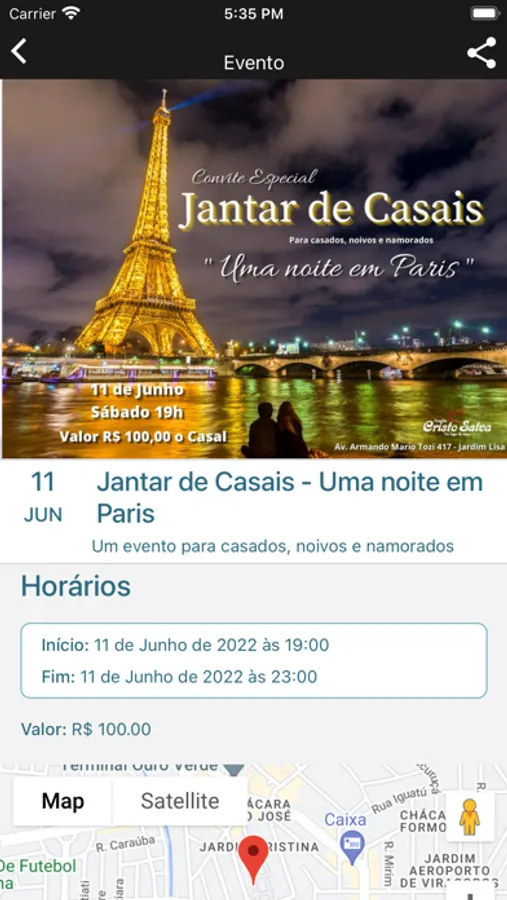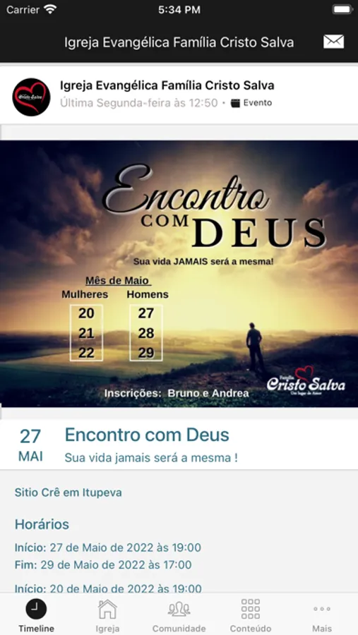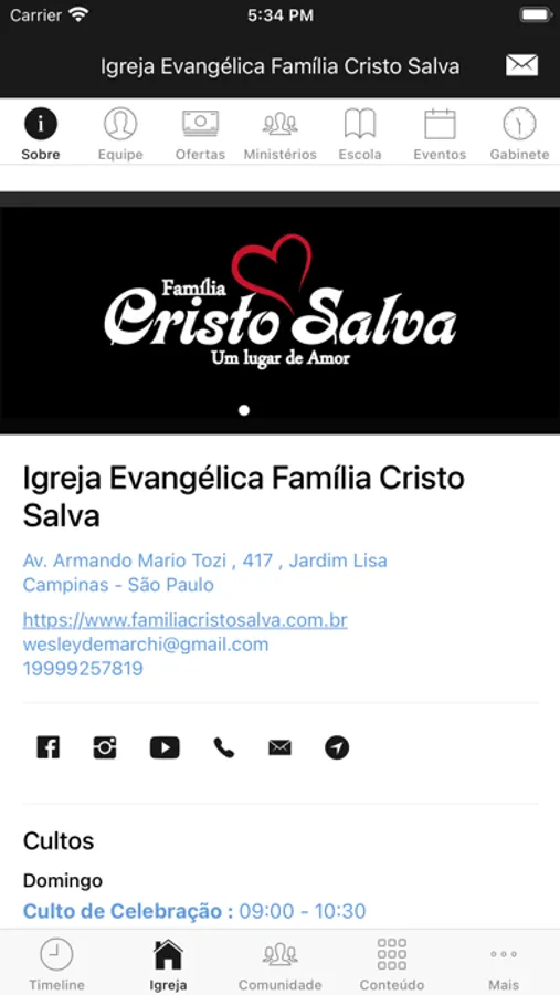 - Informações da Igreja (endereço, telefone, site, redes sociais, pastores)