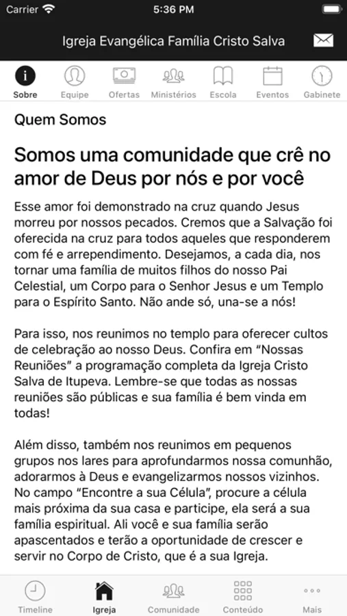 Aplicativo criado para conectar os membros da igreja, facilitando sua comunicação e unindo todos os conteúdos da igreja em um só lugar. Receba em primeira mão as notícias, avisos, vídeos, eventos e tudo mais que a igreja envolve.