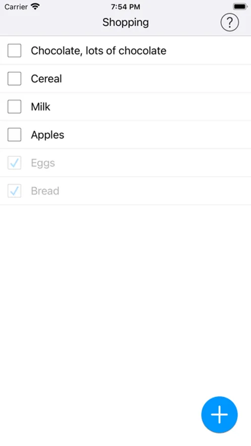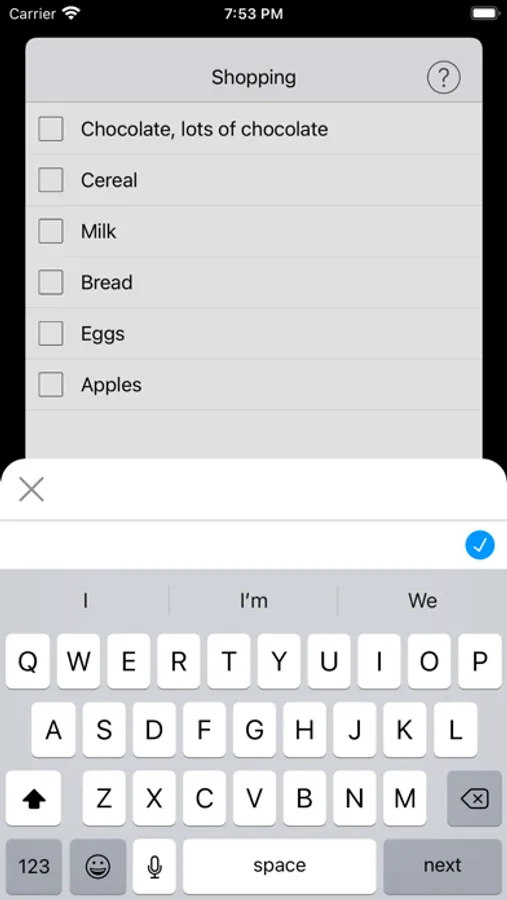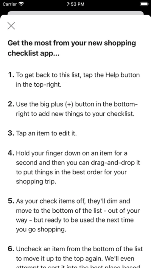 • Since we often shop for the same things over and over, when you check an item, it doesn't go away, it just dims and moves to the bottom of the list. When it's time to shop for that item again, just uncheck the box and it'll move up to the top section. It will even sort itself based on how you've ordered items for previous shopping trips.