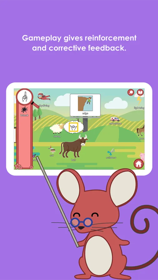 • Increases engagement and motivation for mastering sign and print vocabulary by learning and practicing interactively.