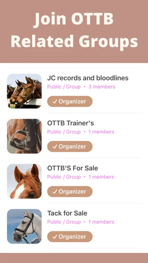 A community for off the track Thoroughbred enthusiasts. It is a social media platform exclusively for OTTB owners. You will be able to post on an activity wall, message other members, join OTTB specific groups, discuss OTTB specific topics in forums.