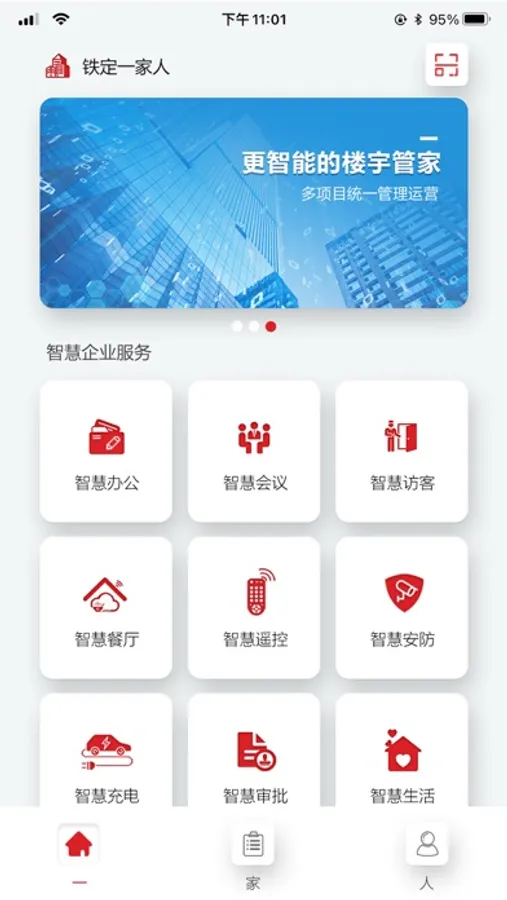 铁定一家人,为员工提供综合型智慧服务,包含智慧办公、智慧会议、智慧访客、智慧餐厅、智慧遥控、智慧安防、智慧充电、智慧审批、智慧生活等服务。助力企业进行智慧化数字化升级管理,提升信息化水平和能力,给员工提供方便快捷的智慧办公及生活服务。