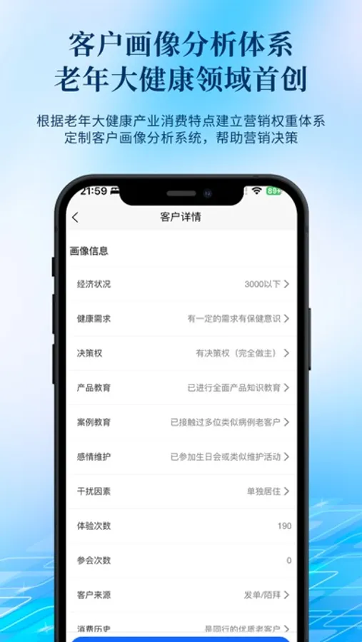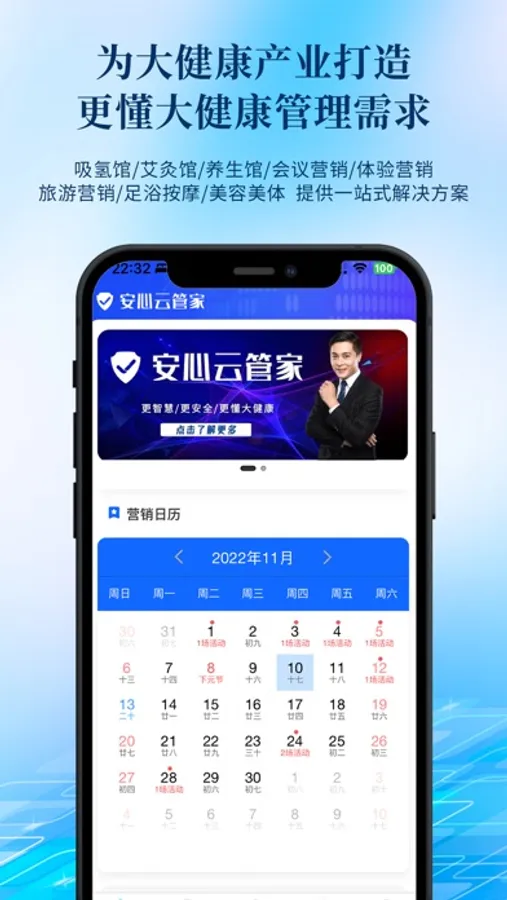 一款中国大健康产业从业者的全能智能云管理APP——专门为中国大健康产业会议、体验、旅游营销、中医馆、艾灸馆、吸氢馆、足浴馆等机构定制开发的综合管理系统,不仅管客户、管订单、管回款、管欠款存货,还管员工终身在线学习哦。