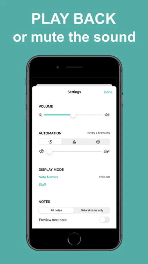 * Strengthen your knowledge of note names on the staff with our delayed display feature. As each note appears, its name is revealed below the staff, allowing you to associate the visual representation with its name.