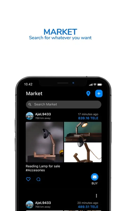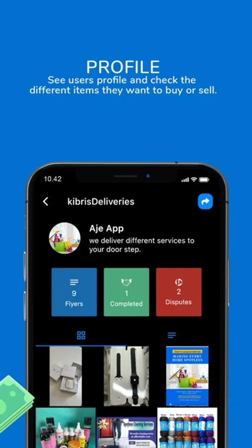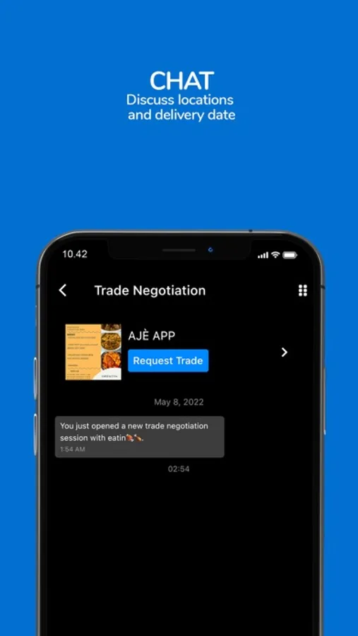 The Ajé community is a social marketplace that allows you see trade posts of community members that are in close proximity to you. A community member can search through flyer content in finite proximity to them, and by tapping on the Buy/Sell button, a member can engage a trade partner on content of their trade post. Tapping on the Buy/Sell button, opens a dialogue between both members of the community.