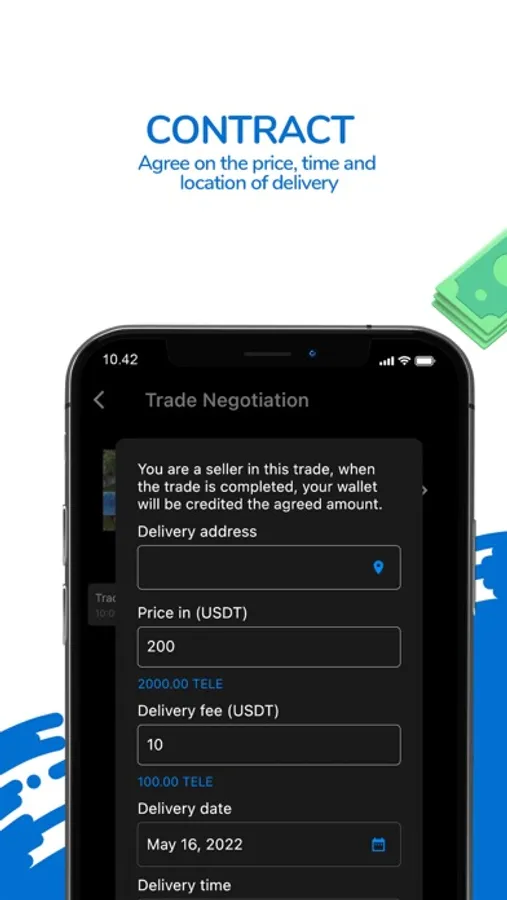 Once the dialogue is engaged between trade partners, they will have 24hrs to discuss and agree on trade terms. The trade button within the dialogue prompts a trade agreement contract form, this contract stands as the binding agreement between trading partners. Price, Delivery Fee, Delivery Location and Delivery Time on the trade agreement contract is completed by one trade partner and sent to the other party for confirmation. When the trade agreement contract form is completed and confirmed, the buyer’s wallet is charged.