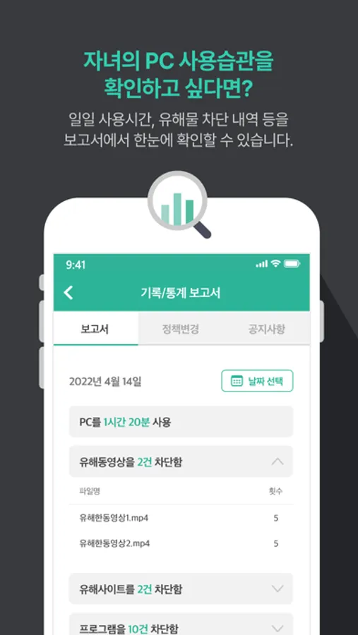 사용시간과 차단내역을 일별로 확인할 수 있어요.