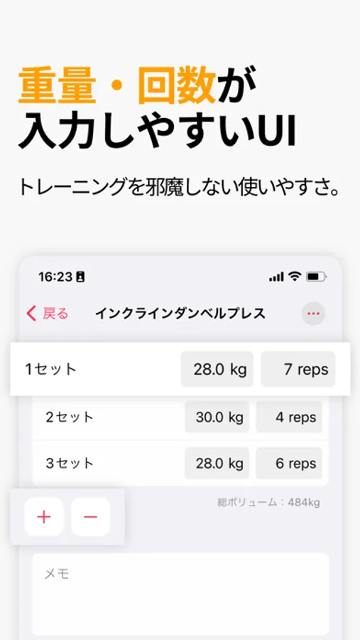 • Keep track of your daily training records (number of sets, weight, number of times). It's super easy.