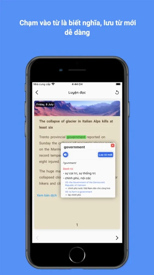 3. Chạm vào từ trong bài đọc là có thể biết nghĩa, có thể lưu từ mới và câu chứa từ đó để ôn luyện mỗi ngày, vốn từ vựng sẽ tăng rất nhanh