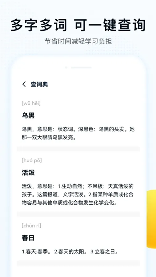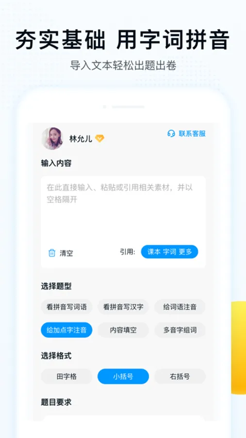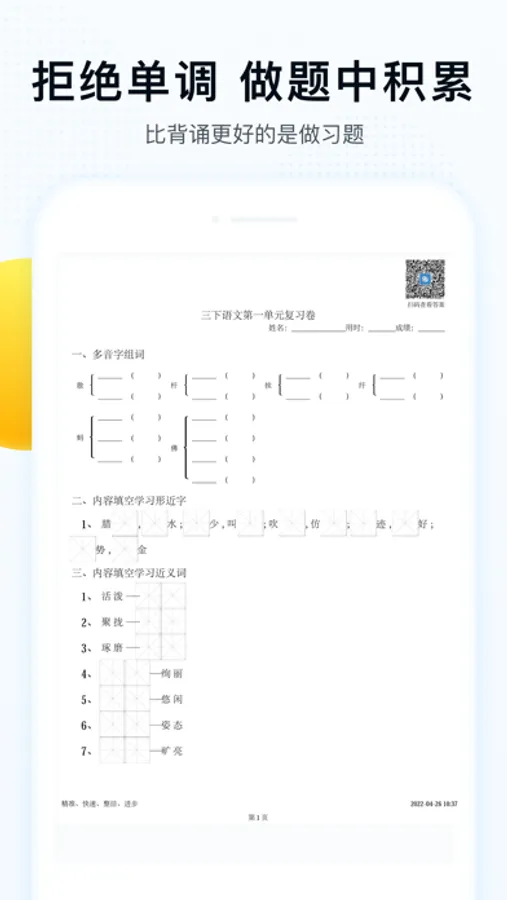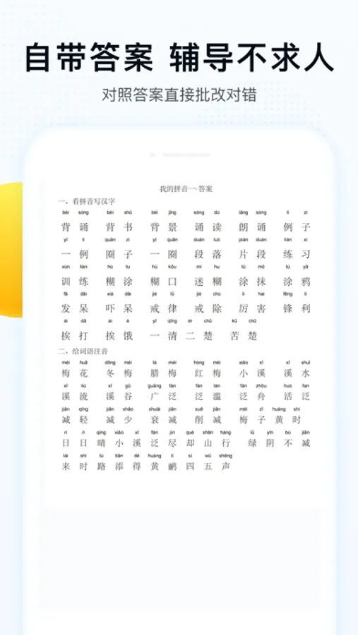 夯实基础,用字词拼音,导出文本轻松出题出卷,拒绝单调,做题中积累,多字多词,可一键查询,节省时间减轻学习负担,自带答案,辅导不求人,对照答案直接批改对错。