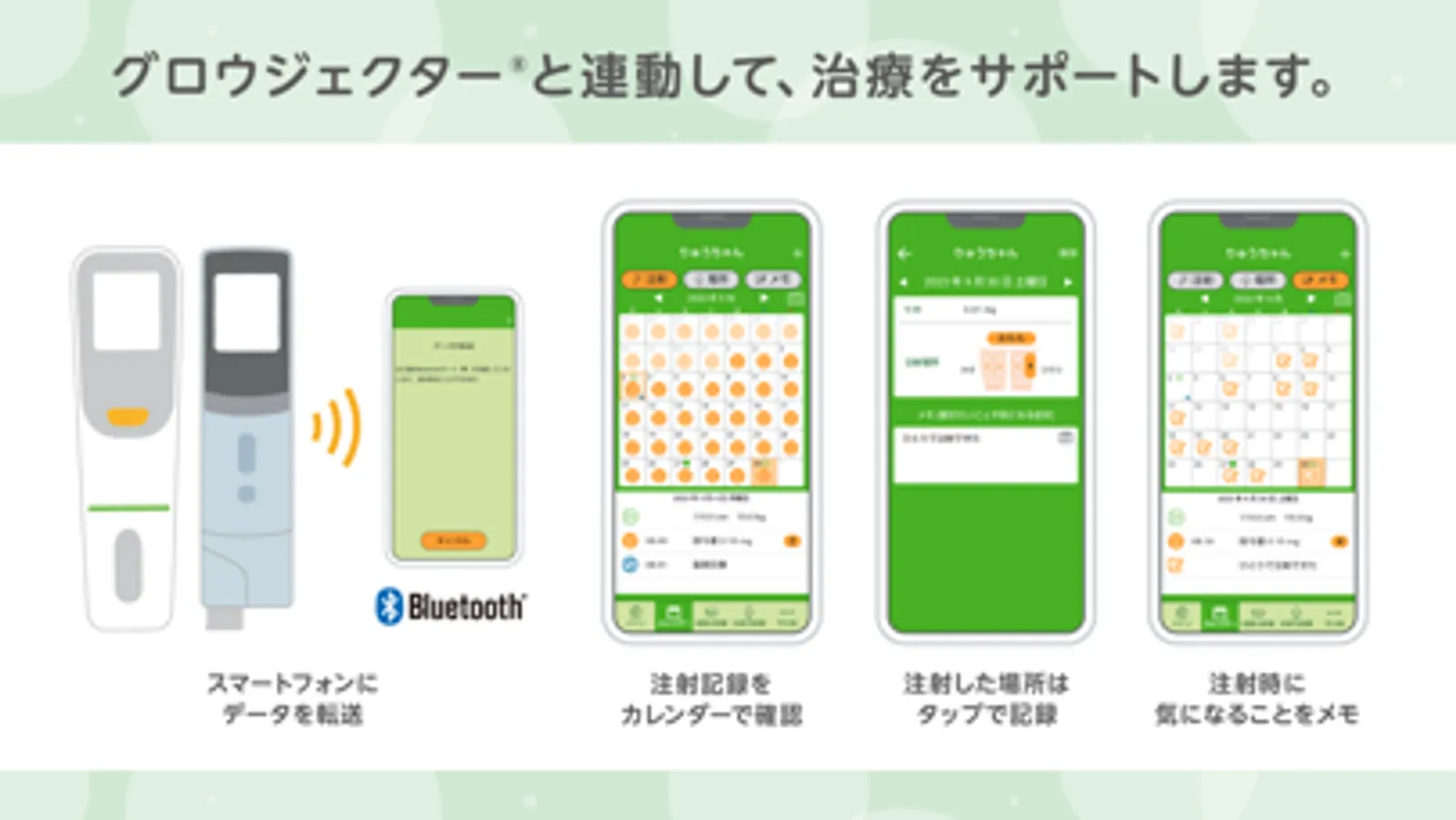 ●グロウジェクター®とのBluetooth®接続により、注射の記録(投与日・時間・投与量・薬の交換日)をアプリで確認できます。
