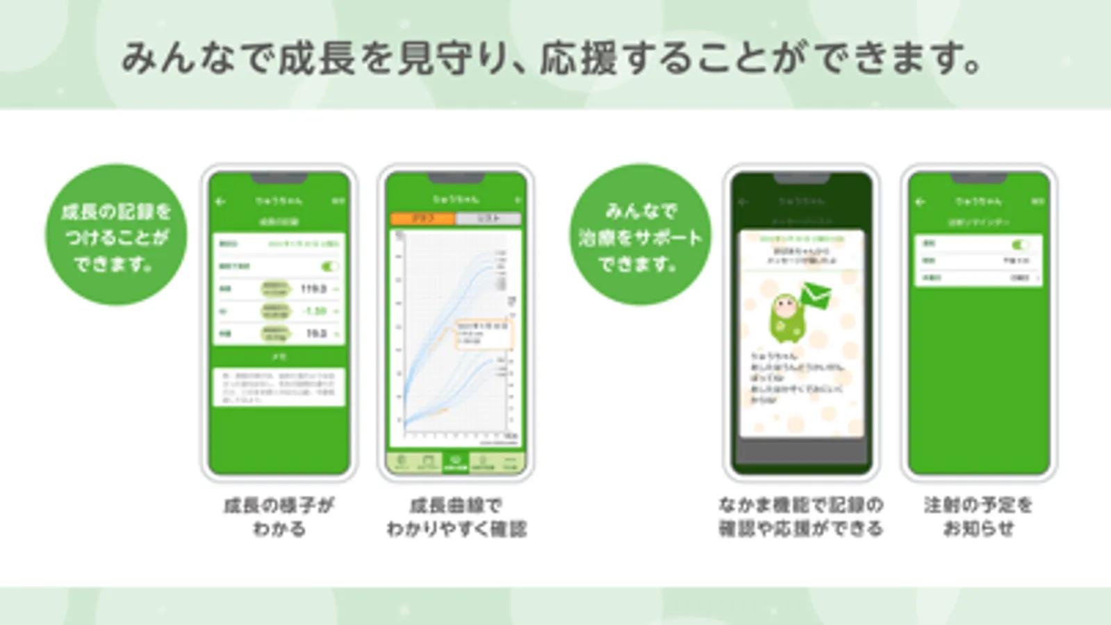 ●なかま機能で登録した家族や医療従事者などが患者さんの注射や成長に記録をスマートフォンで確認できます。それぞれがメッセージを送って応援することもできます。