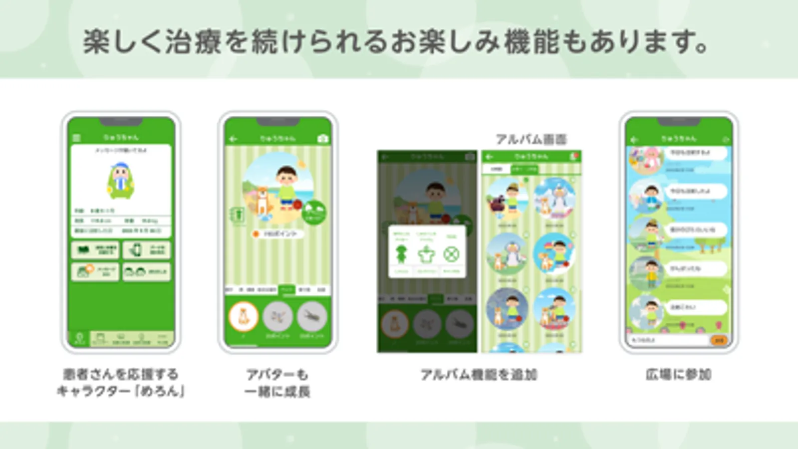 ●アプリに登場するキャラクター「めろん」が、患者さんの年齢に応じて成長、季節に合わせて変化します。患者さんを見守り、毎日の治療を応援してくれます。