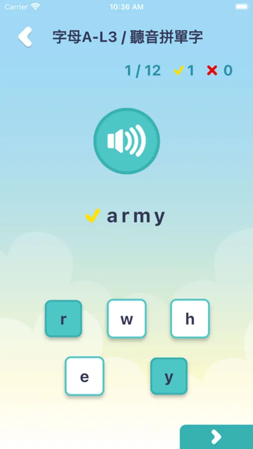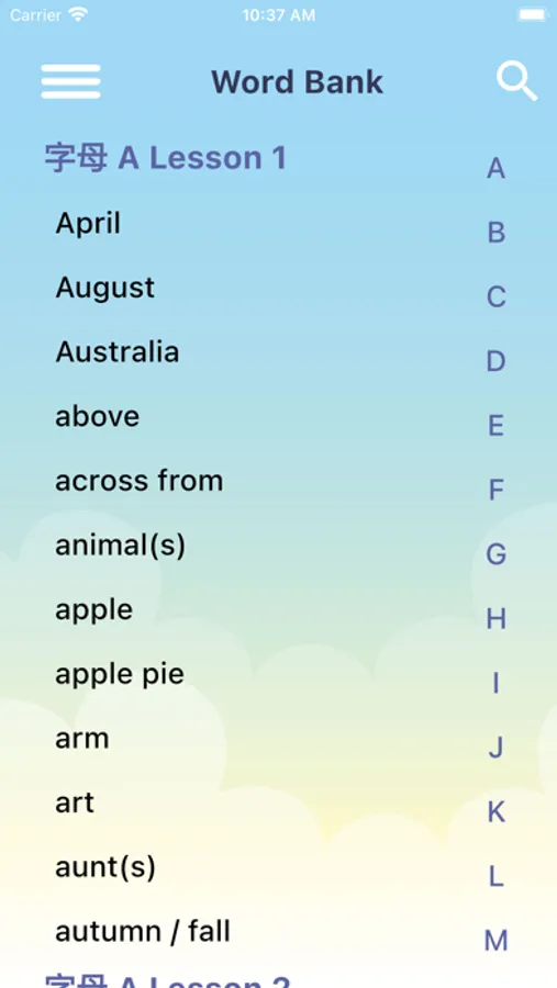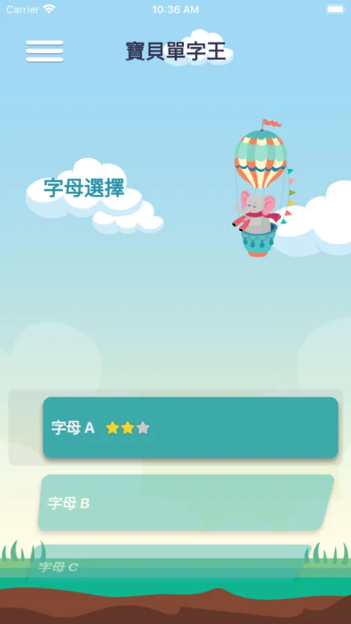 APP 內Word Bank及關卡以字母為排序,讓基礎字彙可以依順序學習,也可以快速找到自己想要的單字。