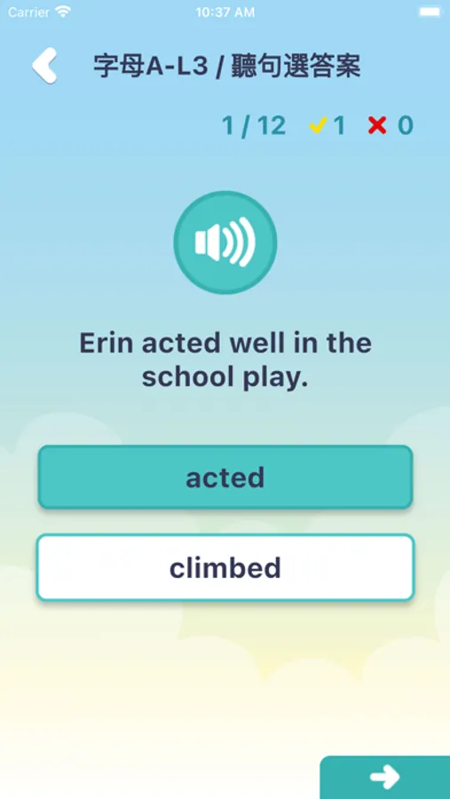 - 聽句選答案:聆聽句子音檔選出正確的單字