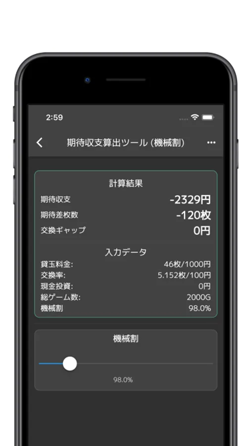 ● 回転数と差枚数から出玉率(機械割)を算出するツール