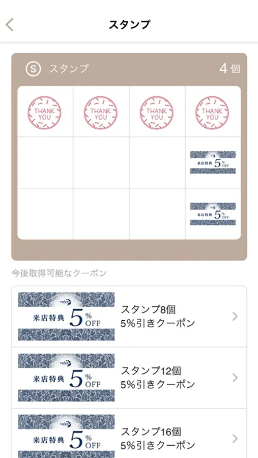 ご来店スタンプをためるとお得なクーポンが発行されます(ご利用条件がある場合がございます)