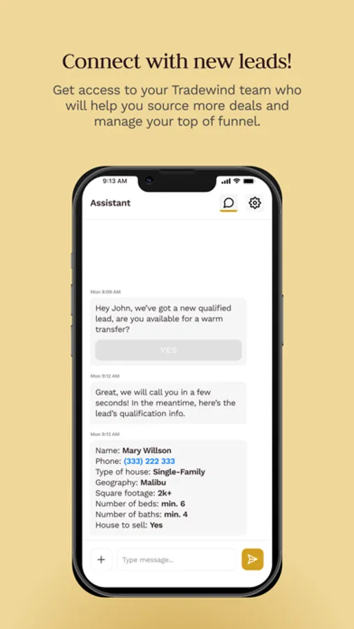 If you use Tradewind through your brokerage, then download this companion app to your iPhone to manage lead followup and handoff when you’re on the go. With the Tradewind Messenger app, you can: