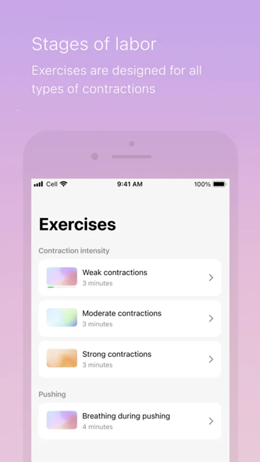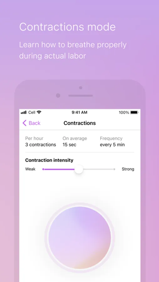 As your contractions start, select their intensity based on your sensations. The app will help you choose the most appropriate breathing pattern. Taking control of your breath works as meditation, it helps you calm down and relax. The app counts your contractions displaying the frequency and intervals. This will help you understand how soon you’ll go into labor and when it’s time to go to hospital.