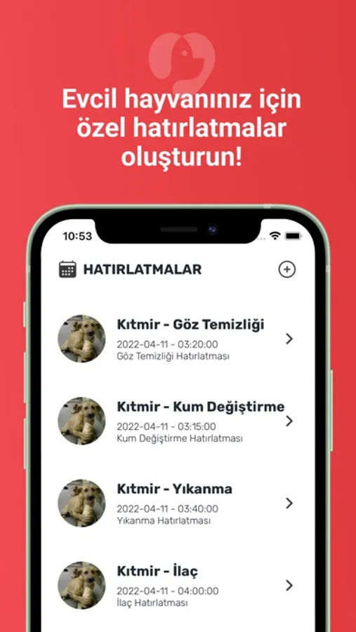 Kitty Kitty'e kaydettiğiniz evcil hayvanlarınız için belirlediğiniz tarihlerde ve belirlediğiniz aralıklarda(her gün, her hafta, her ay vs.) size hatırlatmalar(Diş Fırçalama, Doğum Günü, Mama Temizliği, Kum değiştirme vs.) gönderilir.