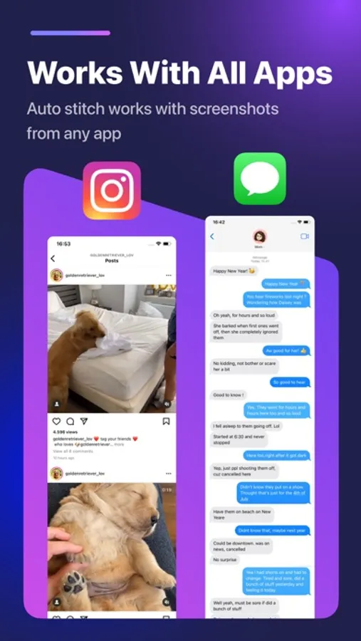 Stitch Photos allows you to create a full conversation screenshot, scrolling app screenshot or full webpage screenshot. Just take some overlapping photos and we will automatically arrange and merge them into one long screenshot for you.