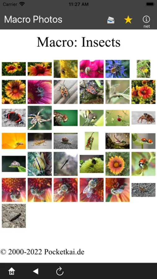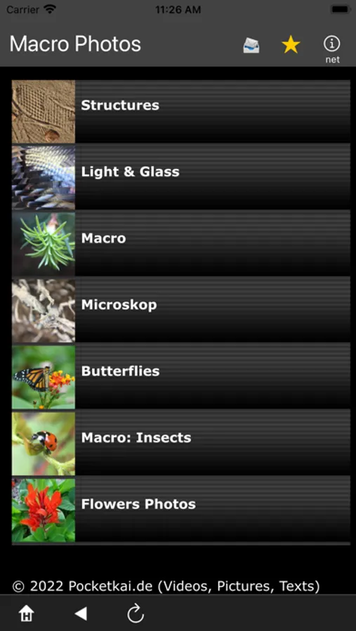 The app shows over 3000 macro photos from nature. Structures, flowers, butterflies, insects, plants. You can view the individual images enlarged and save them in the photo album. You can use these photos freely, privately or commercially, without copyright.