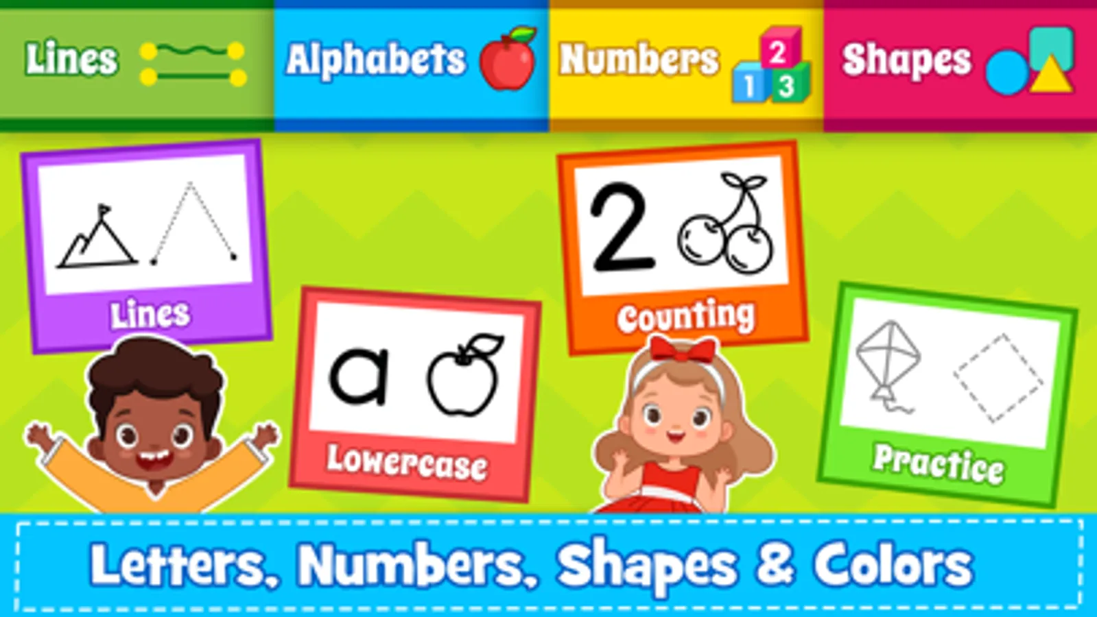 Best Learning apps for kids with tracing and phonics games. Learning of English letters, numbers, Shapes, curves, slanting lines, straight line, simple lines and free drawings, colors and more other basic vocabulary. Any toddler, kindergartner or preschool age child can learn English and the English alphabet and numbers simply kids tracing letters by following their finger