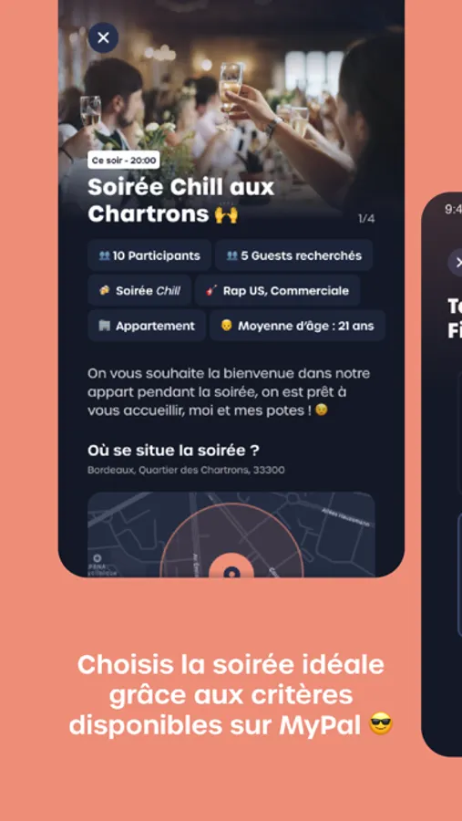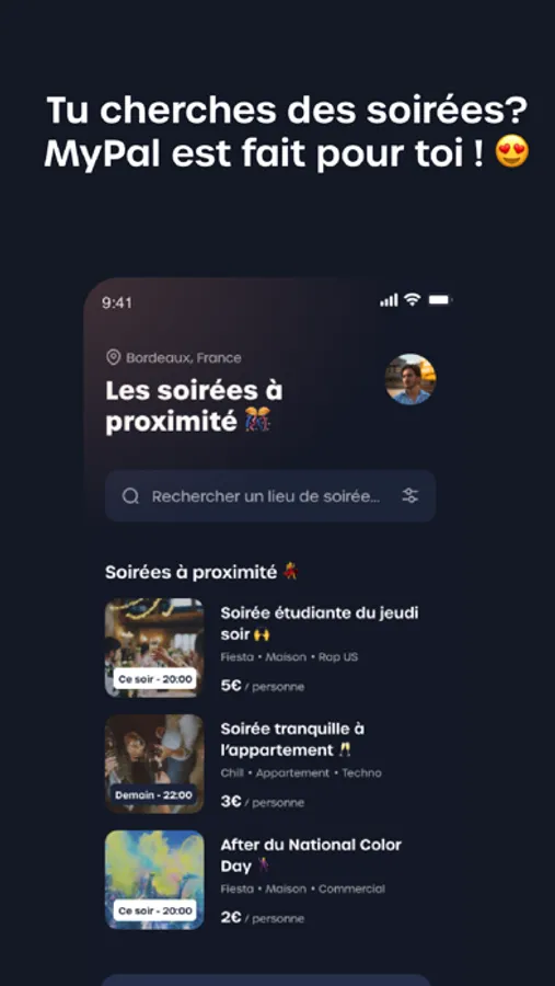 MyPal est une application de mise en relation qui permet aux utilisateurs de trouver des soirées chez des particuliers et qui leur permet également de pouvoir proposer des soirées chez eux, en choisissant d’être rémunéré ou non, et ça, en toute sécurité.
