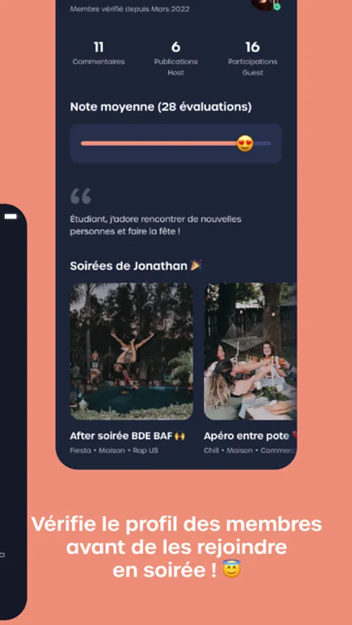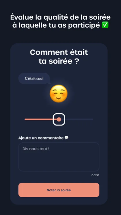 Après chaque soirée, grâce à un système de notation, les membres peuvent s’évaluer et poster des commentaires sur la qualité de la soirée dans le but de créer une communauté de confiance.
