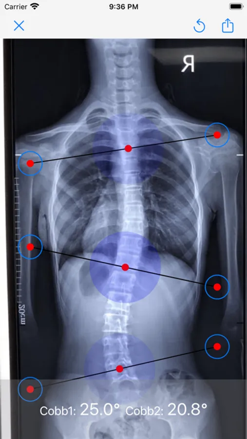 本软件可用于自动智能测量脊柱侧弯cobb角,只要上传合格的全脊柱正位X光片,即可自动得出cobb角。