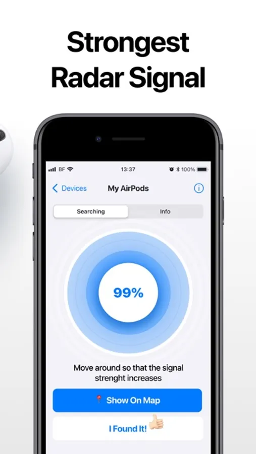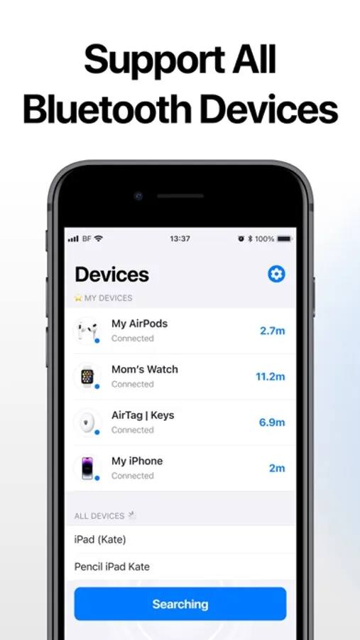The radar shows all compatible devices near you. The closer you are to your misplaced item, the higher the Bluetooth energy signal percentage.